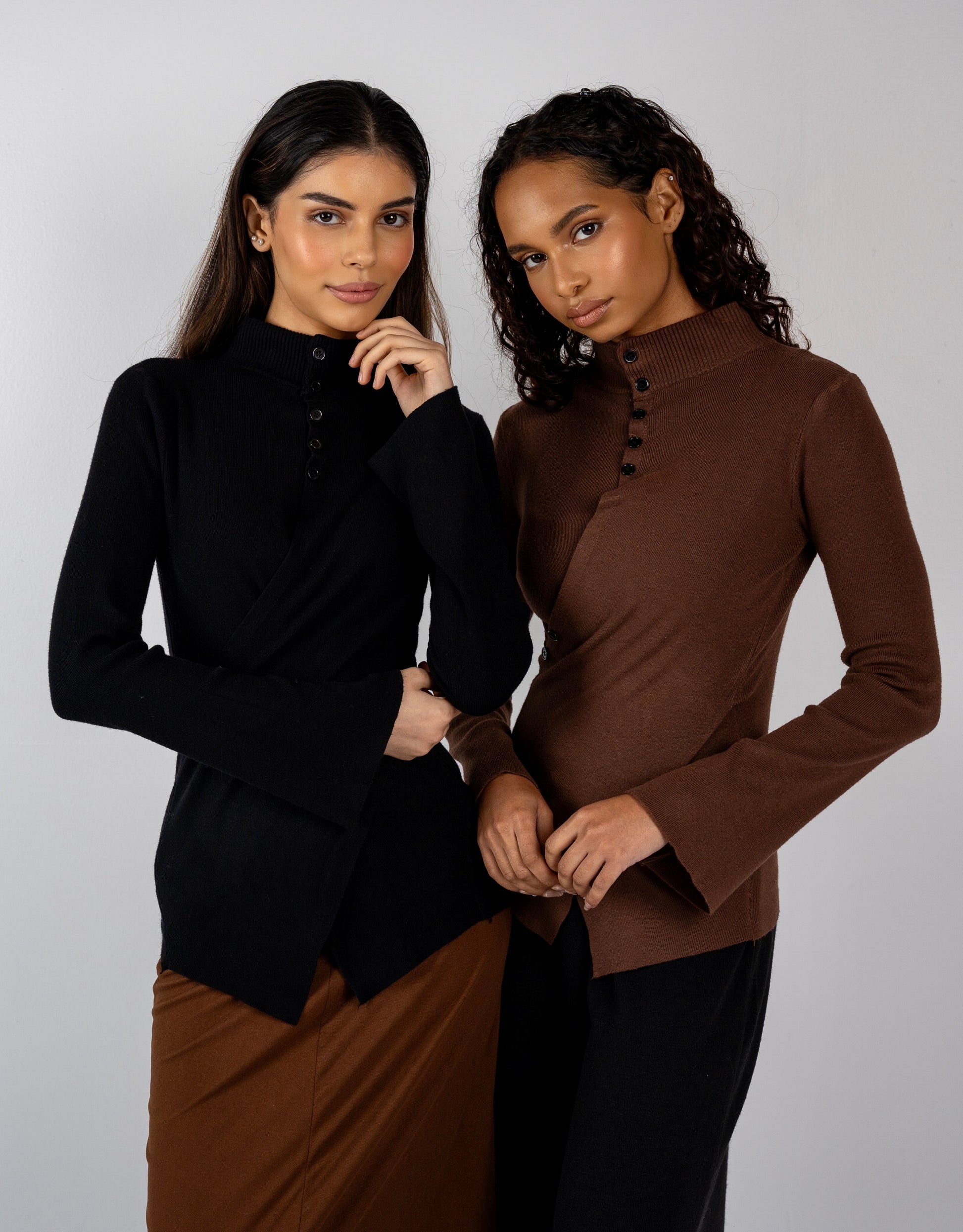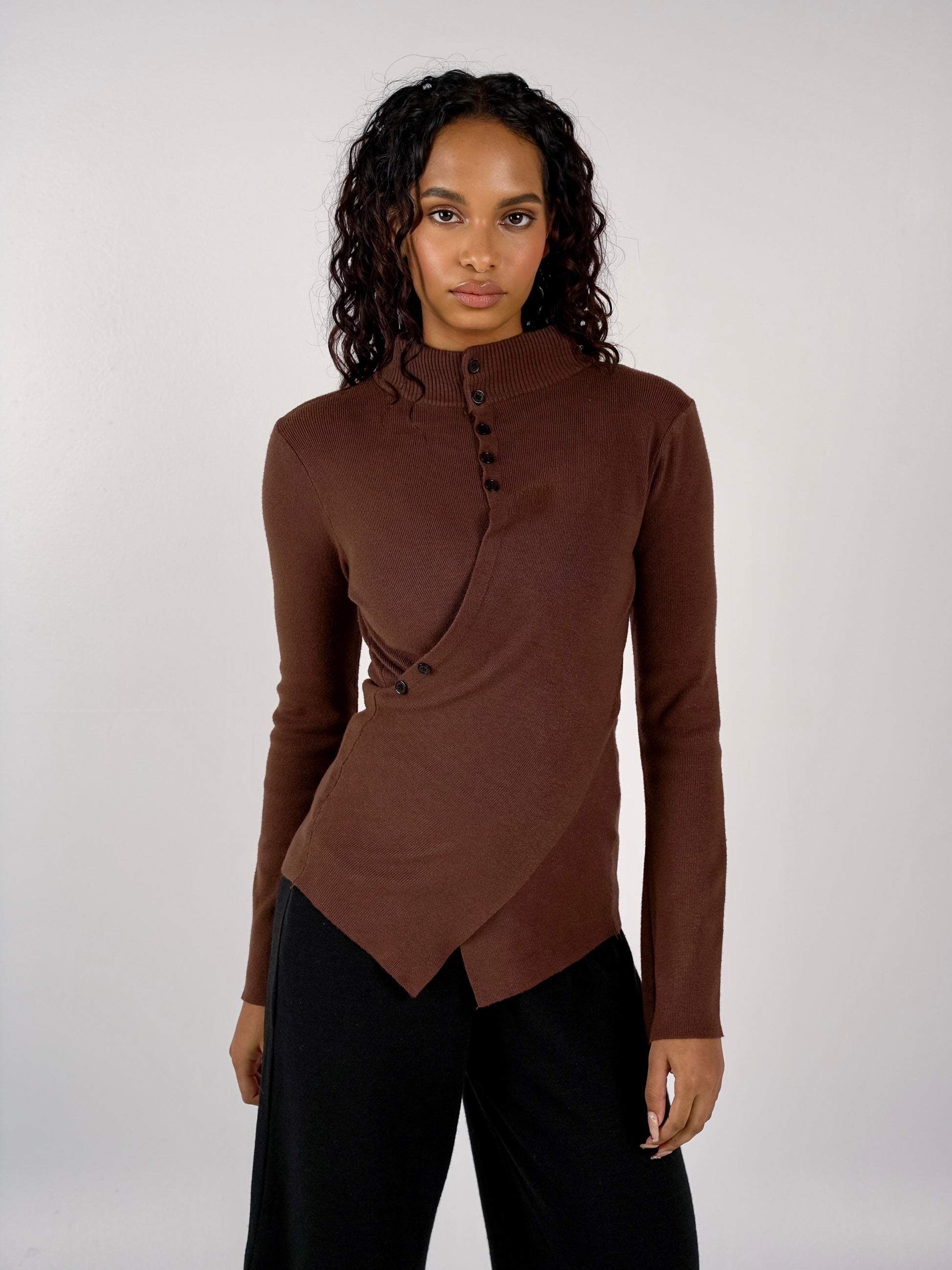 This Asymmetric Knit Top features a high neck, button detail and subtle flared sleeves. The unique design provides a flattering draped fit whilst the soft knit material ensures comfort.